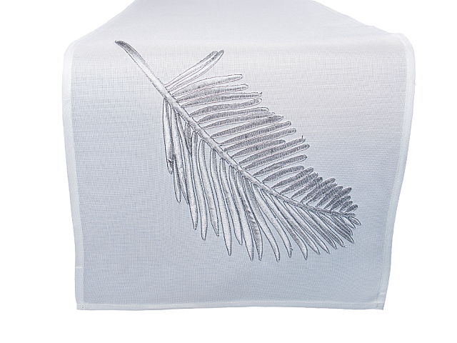 Elegancki bieżnik wykonany z poliestrowej tkaniny na której zostały wyhaftowane metaliczną nitką palmowe liście.
