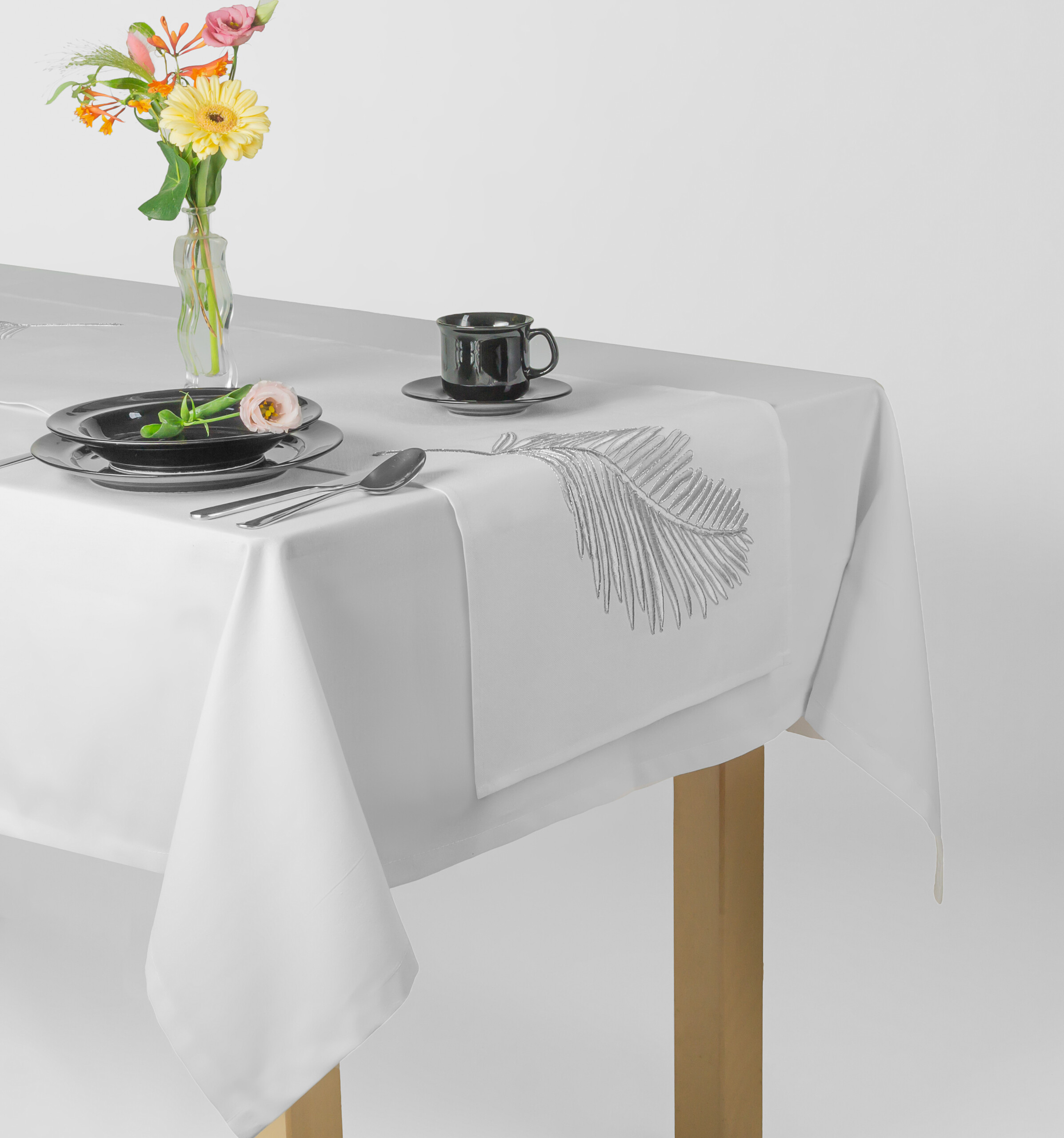 Srebrne aplikacje znakomicie kontrastują z białym tłem serwety, nadając nowoczesny styl w dobrym guście.