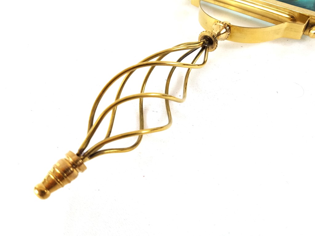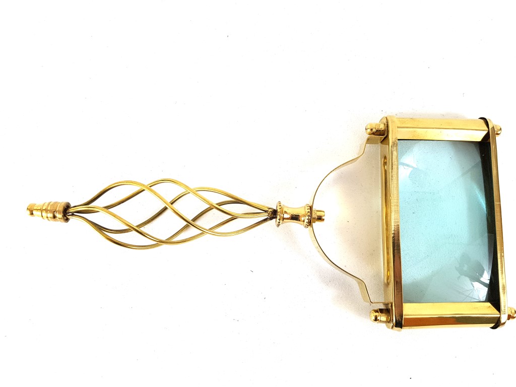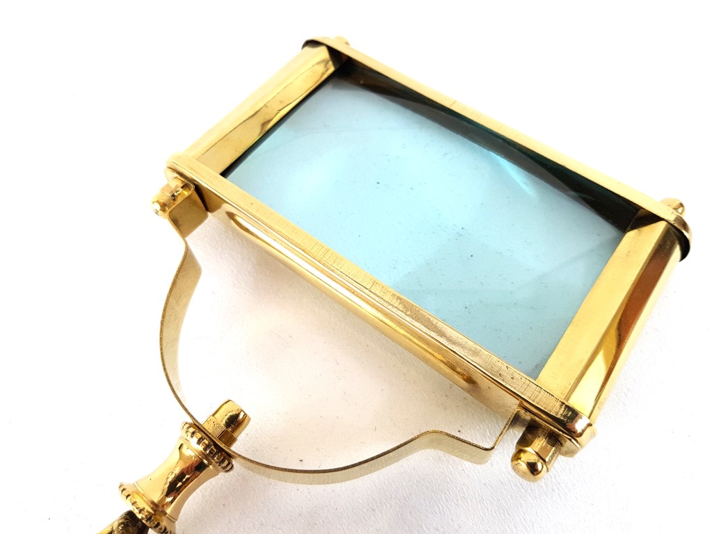 Duże, prostokątne mosiężne szkło powiększające z drucianą rączką.
