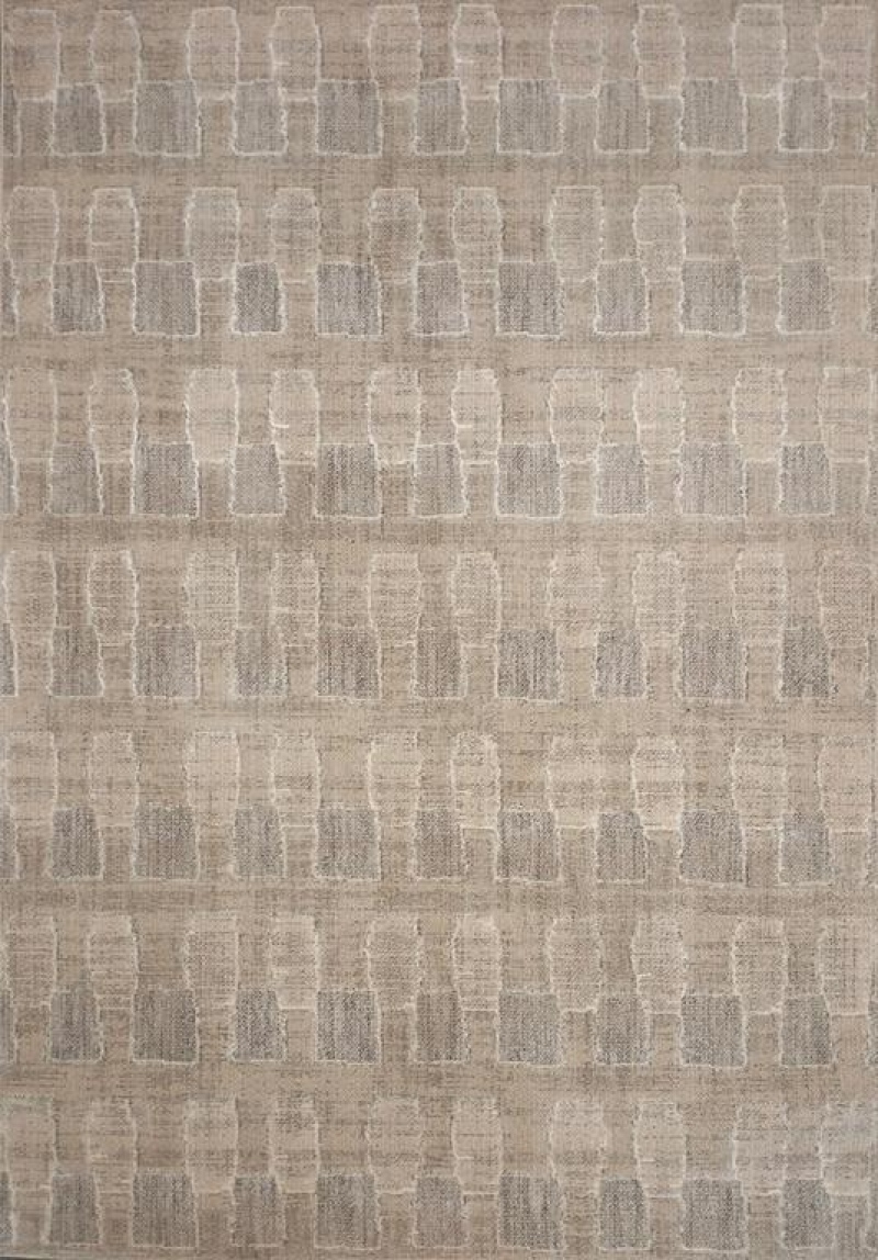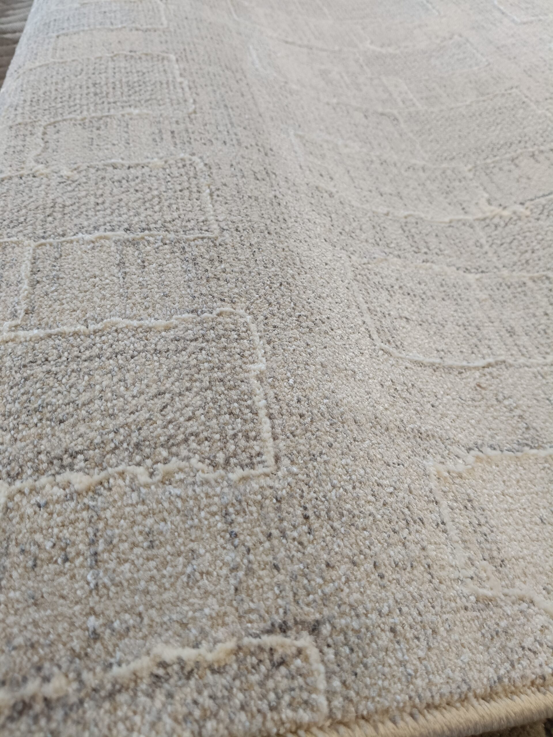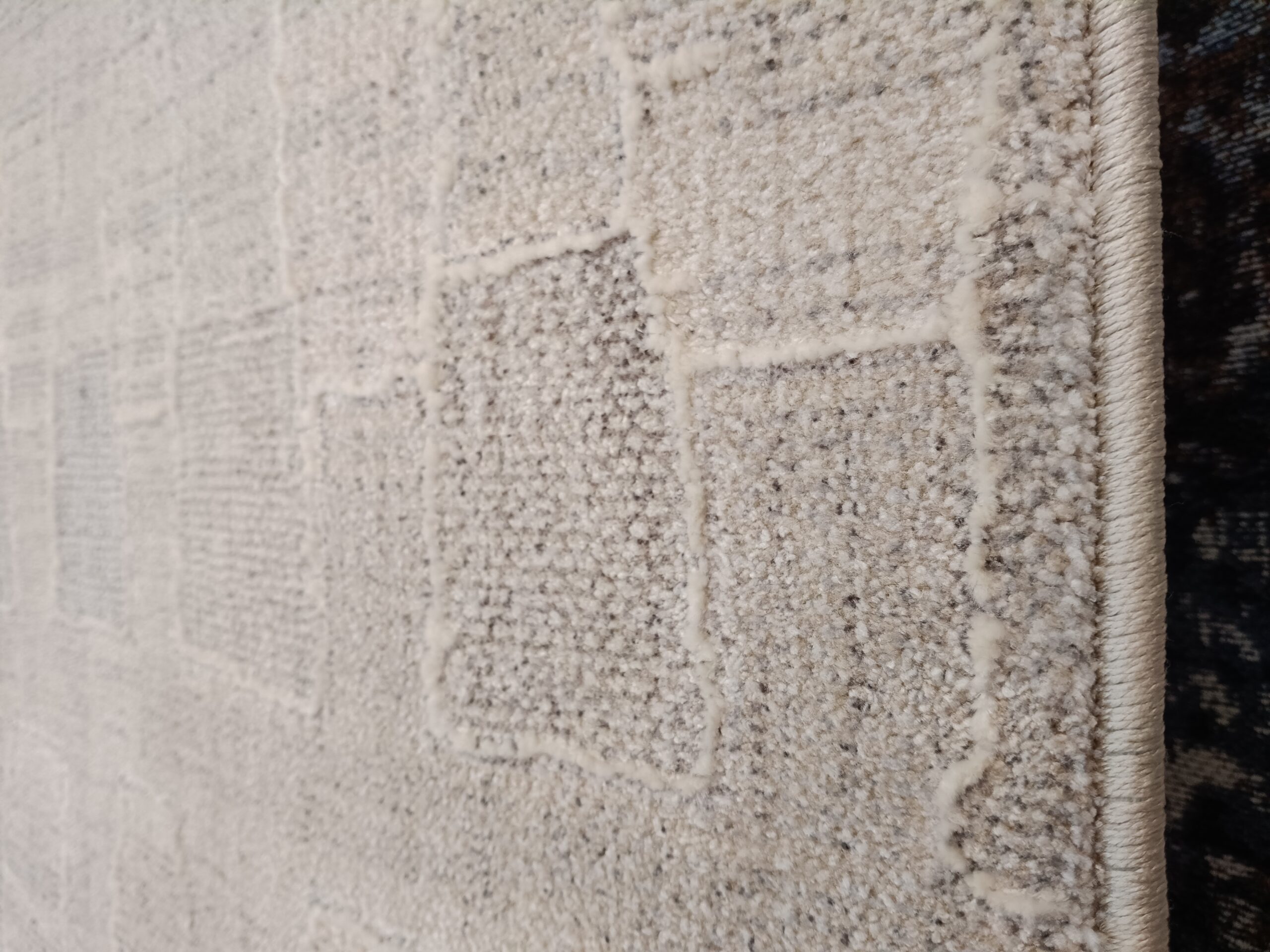 Czysta forma i miękkość nici. Gruby dywan w tonacji szarej i beżowej.