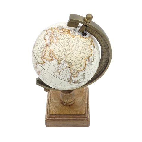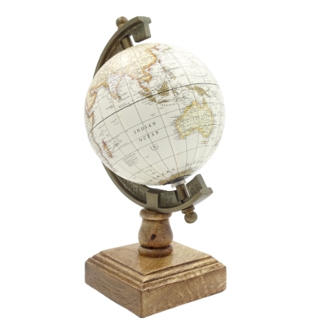 Niewielki globus na drewnianej podstawie. Grzbiet metalowy.