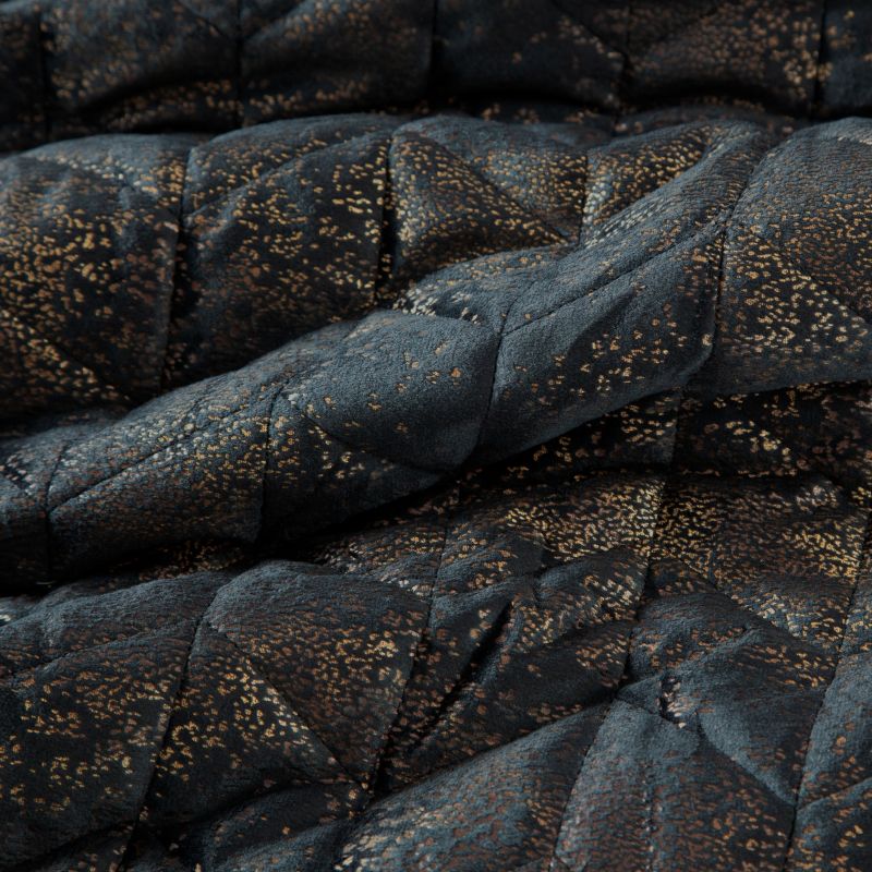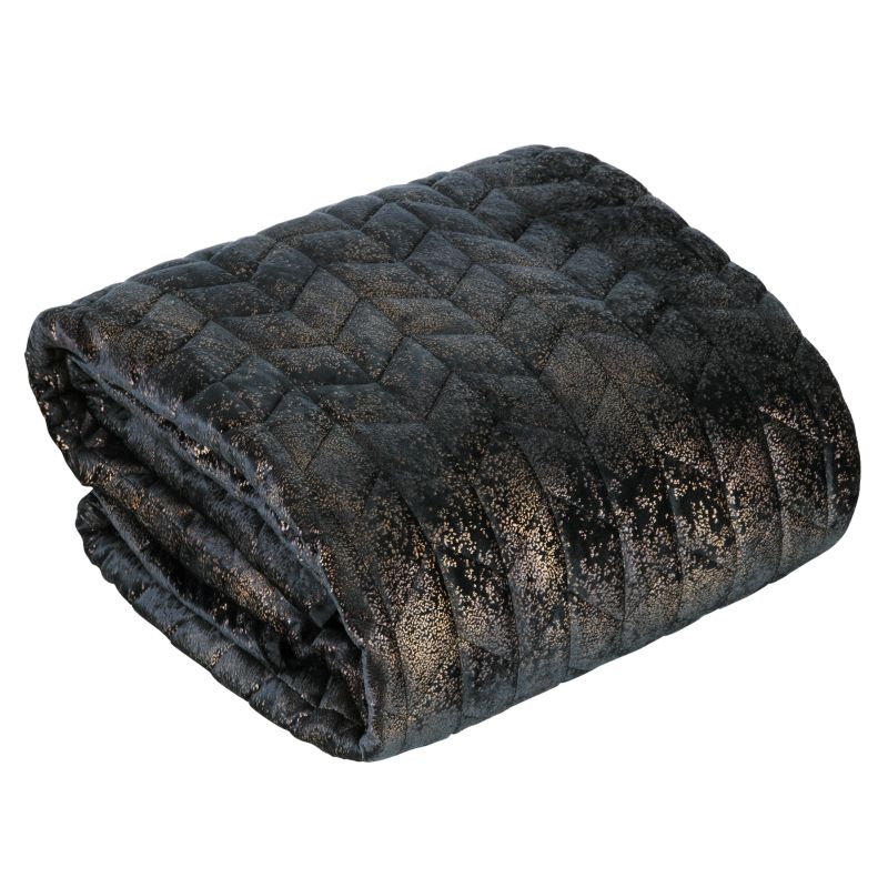 Narzuta ma modny kolor i fason przecieranych barw. Czerń połączony jest z metalizowanym drukiem w kolorze złota.