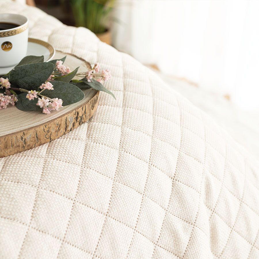 Narzuta Molly to elegancki dodatek, który wniesie do każdego wnętrza przyjemny i delikatny styl. Narzuta wykonana z tkaniny o ciekawym splocie, przeszyta pikowaniem w kształcie karo.