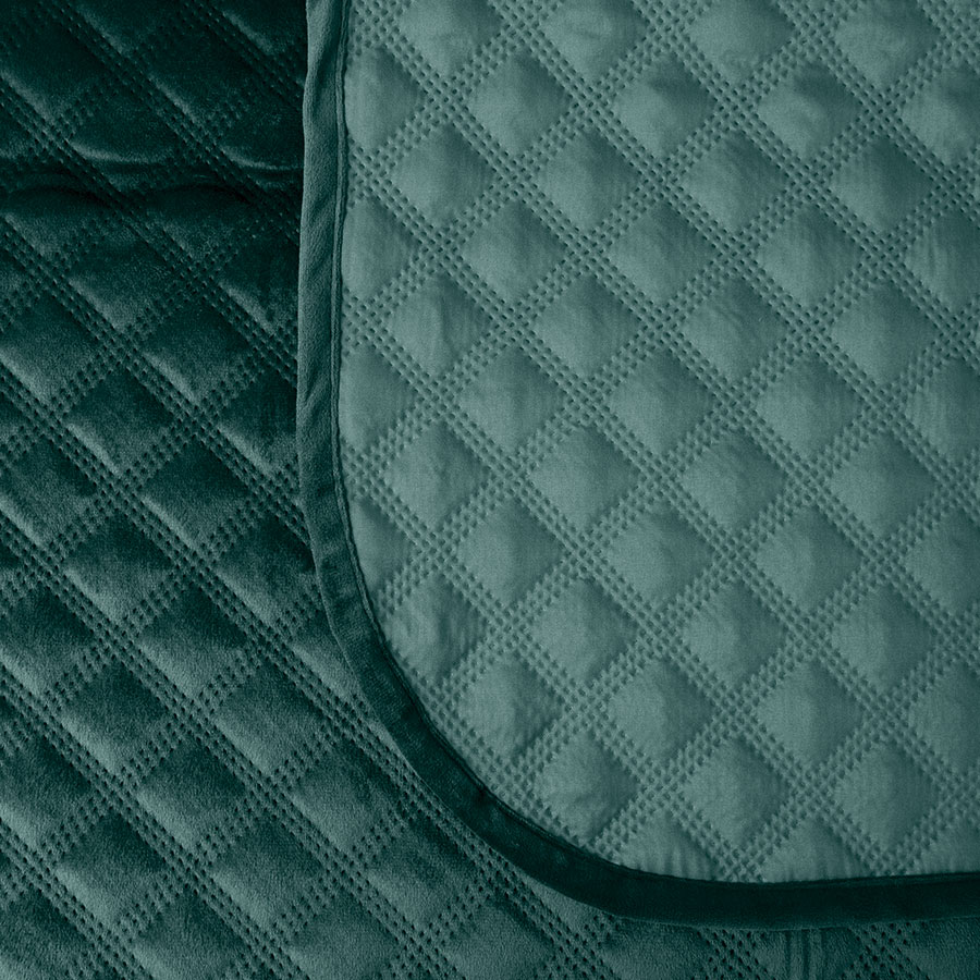 Narzuta dekoracyjna, pikowana. Wykonana z welwetu. Posiada pikowanie w kształcie karo. Zszycia tworzone metodą zgrzewania hot press. Jest ono zdecydowanie solidniejsze od tradycyjnego zszywania. Dzięki temu, że jest wytrzymała i bardzo delikatna, możemy się na niej swobodnie kłaść.