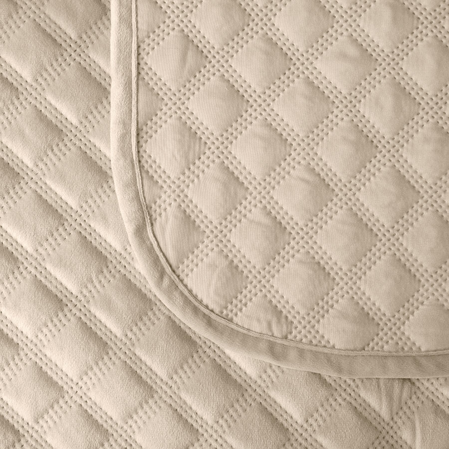Narzuta dekoracyjna, pikowana. Wykonana z welwetu. Posiada  pikowanie w kształcie karo. Zszycia tworzone metodą zgrzewania hot press.  Jest ono zdecydowanie solidniejsze od tradycyjnego zszywania. Dzięki temu, że jest wytrzymała i bardzo delikatna, możemy się na niej swobodnie kłaść.