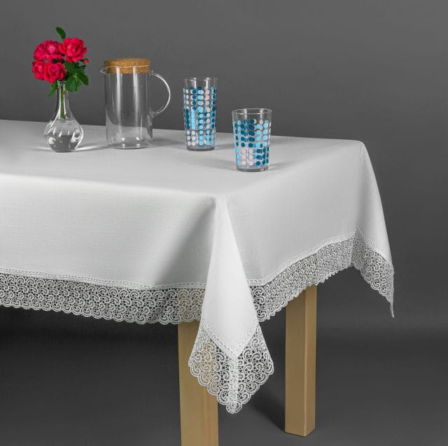 Obrus w kolorze ciepłej bieli, obszyty koronka o grubości 9 cm.