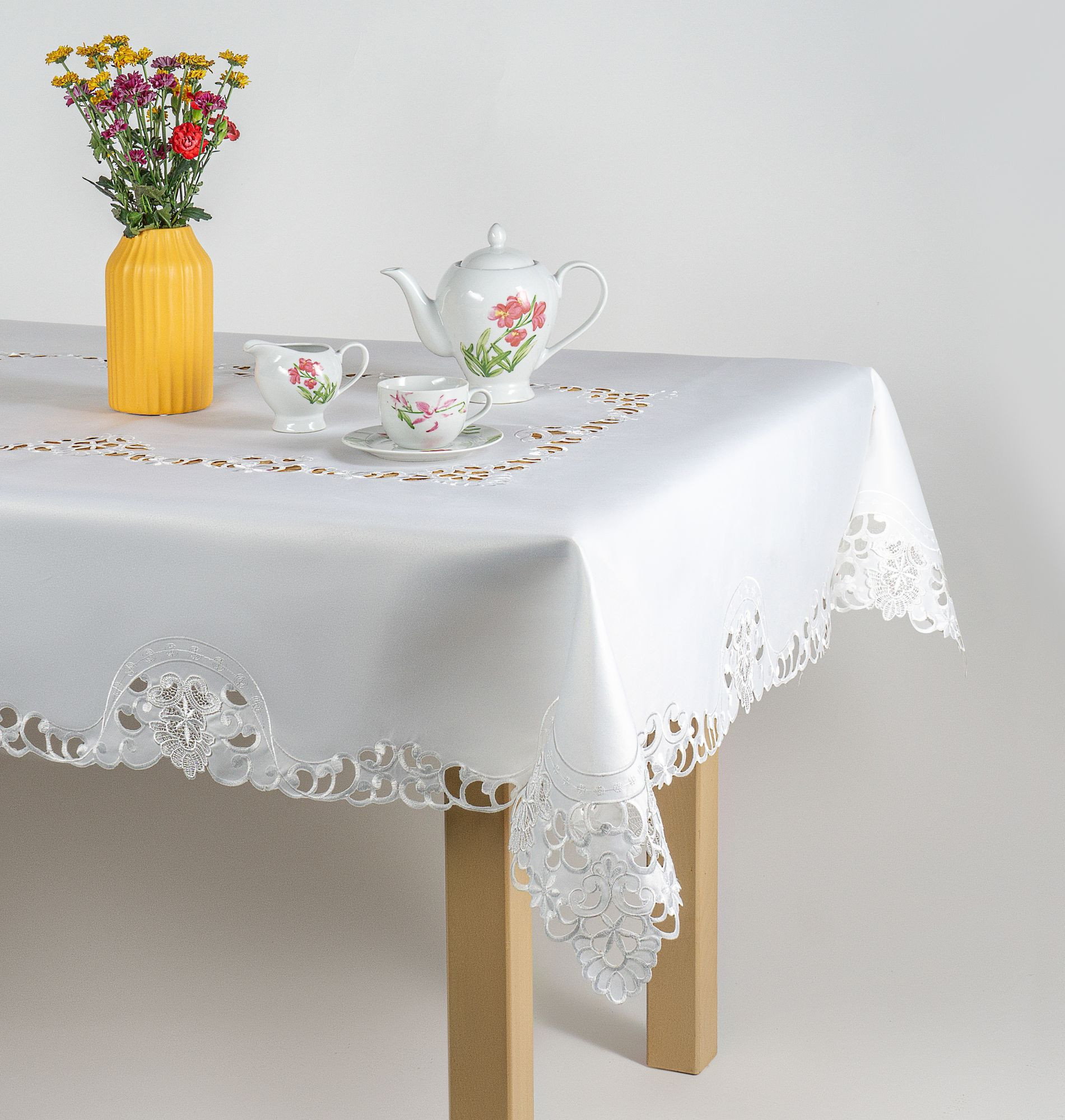 Obrus nasz jest wersją haftu richelieu oraz haftu płaskiego z motywem kwiatowym.