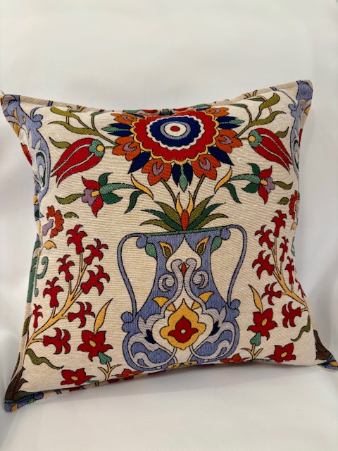 Piękna i kolorowa poszewka wykonana z mocnej, haftowanej tkaniny gobelinowej. Lewa strona jednobarwna tkanina.