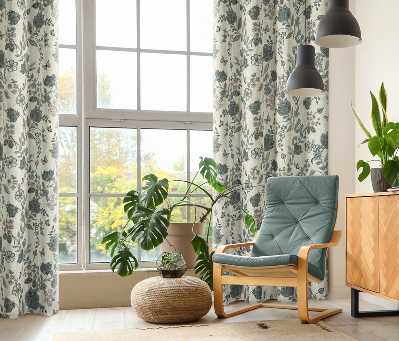 Piękny kwiatowy wzór na tkaninie o splocie płóciennym. Tkanina o średnim stopniu zaciemnienia.